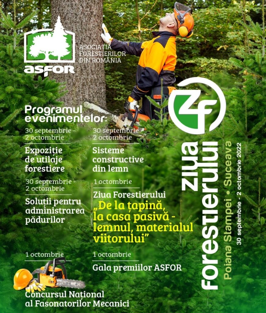 Organizată de ASFOR, Ziua Forestierului va fi sărbătorită anul acesta la Poiana Stampei, în județul Suceava, între 30 septembrie – 2 octombrie. Programul începe vineri, 30 septembrie, la ora 12.00. Sâmbătă, 1 octombrie, începând cu ora 9.00, începe Concursul Național al Fasonatorilor Mecanici.