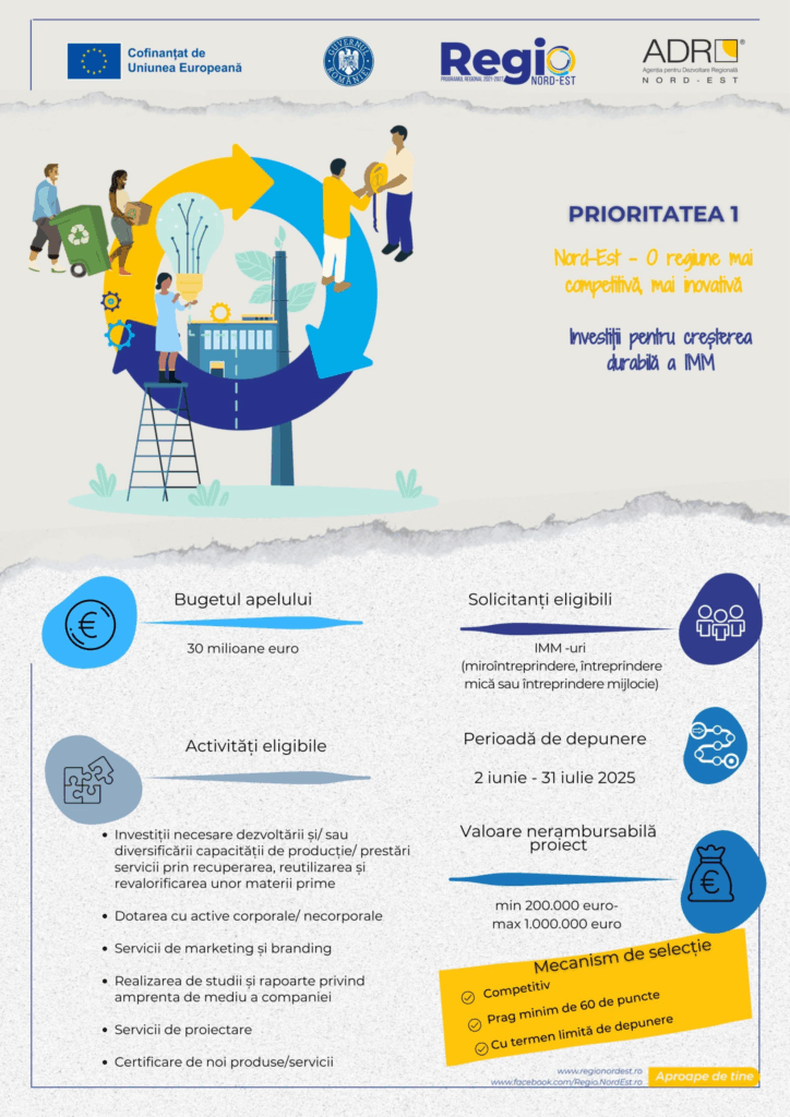 IMM-urile din Regiunea Nord-Est au la dispoziție o nouă oportunitate majoră de finanțare, dedicată tranziției către economie circulară și producție sustenabilă. Agenția pentru Dezvoltare Regională Nord-Est, în calitate de Autoritate de Management, a lansat Ghidul Solicitantului pentru apelul PR/NE/2025/P1/RSO1.3/1/2 – „Investiții pentru creșterea durabilă a IMM”, parte a Programului Regional Nord-Est 2021–2027.
