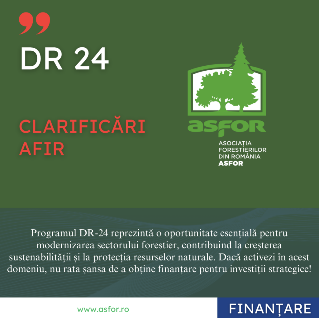 Asociația Forestierilor din România – ASFOR a publicat astăzi, 3 aprilie 2025, pe site-ul oficial, o serie de clarificări transmise de Agenția pentru Finanțarea Investițiilor Rurale (AFIR) privind modul de determinare a volumului de lemn exploatat, relevant pentru accesarea fondurilor prin intervenția DR-24 – Sprijin pentru investiții în exploatații forestiere.