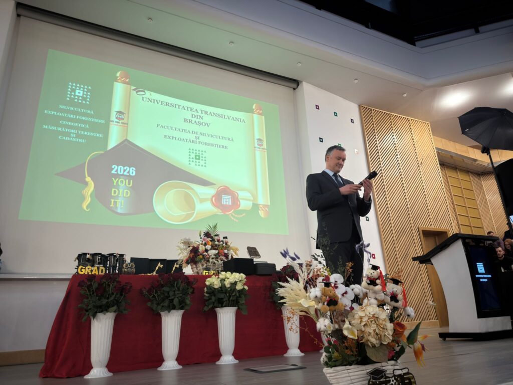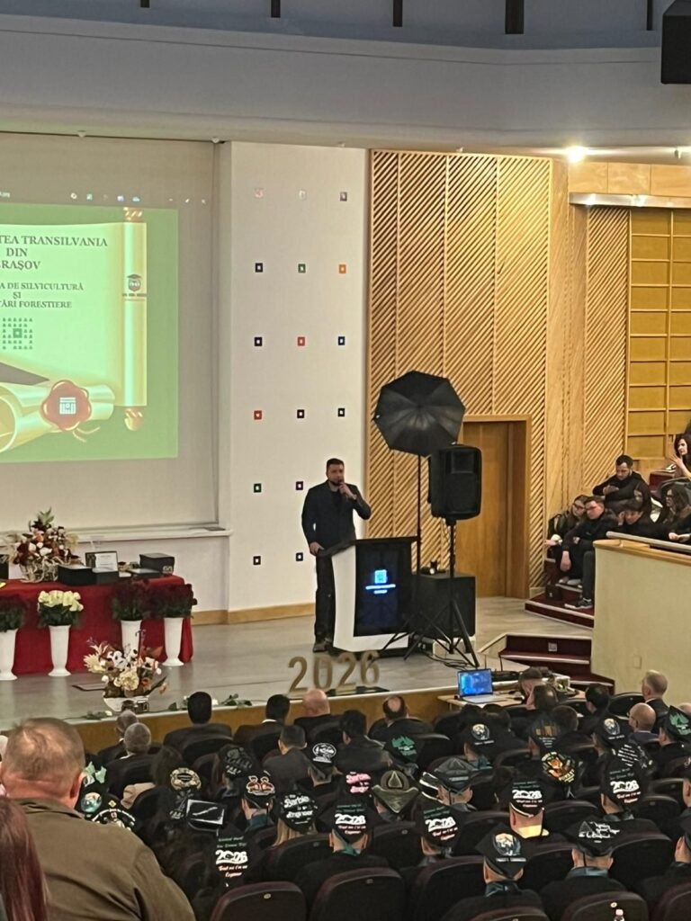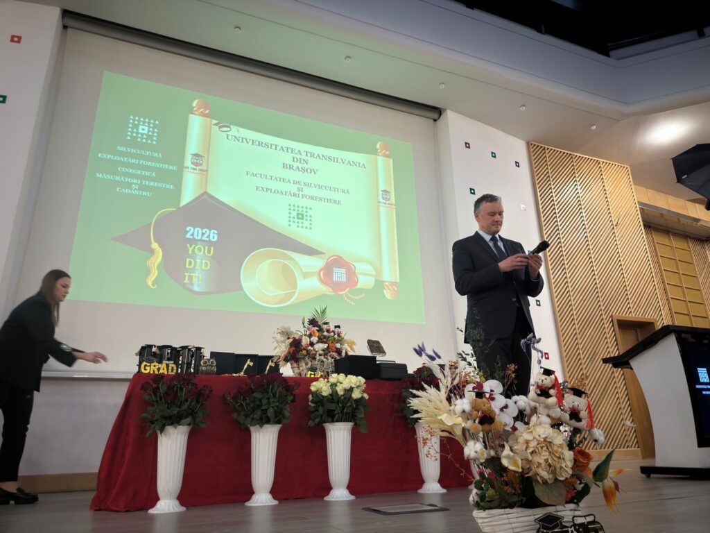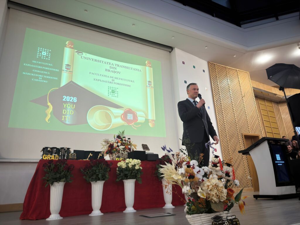 Absolvenții Promoției 2026 ai facultății de profil din Brașov au primit un mesaj de încredere și mobilizare din partea președintelui Asociației Forestierilor din România (ASFOR), dr. ing. Ciprian Dumitru Muscă. Deși aflat la Porto pentru proiectul european Horizon INTERCEDE, președintele ASFOR a ales să fie prezent simbolic prin intermediul unui tânăr profesionist, oferind o lecție despre continuitate și modernizare.