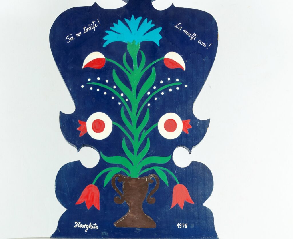 Poartă secuiască în miniatură, realizată din lemn sculptat, decorată cu motive vegetale. Oferită lui Nicolae Ceaușescu de locuitorii din Plăieşii de Jos, jud.Harghita, 1 februarie 1978.