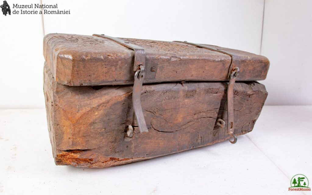 Casă de bani folosită la strângerea birului, realizată dintr-un trunchi de stejar masiv, nelăcuită, înnegrită de patina timpului.