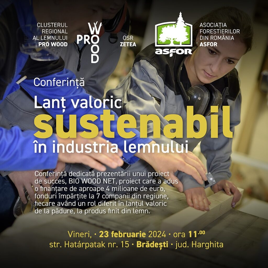 Clusterul regional PRO WOOD și Asociația Forestierilor din România organizează mâine, la sediul Ocolului Silvic privat Zetea, din județul Harghita, Conferința cu tema „Lanț valoric sustenabil în industria lemnului”.