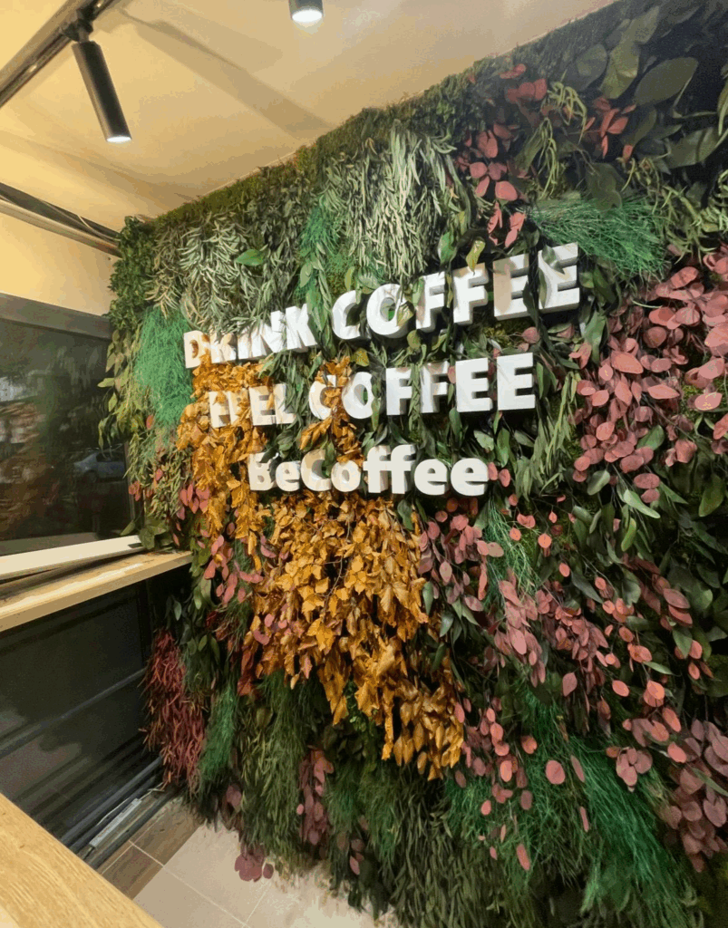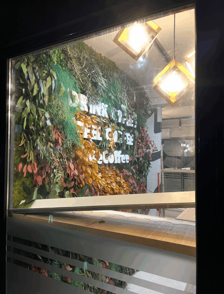 Unul dintre cele mai neobișnuite proiecte a fost crearea unui logo de mari dimensiuni pentru un spațiu comercial, integrat într-o formă geometrică atipică și iluminat indirect. A implicat mai multe tipuri de plante stabilizate, relief diferit și un design personalizat complet, realizat special pentru brandul respectiv, își amintesc specialiștii