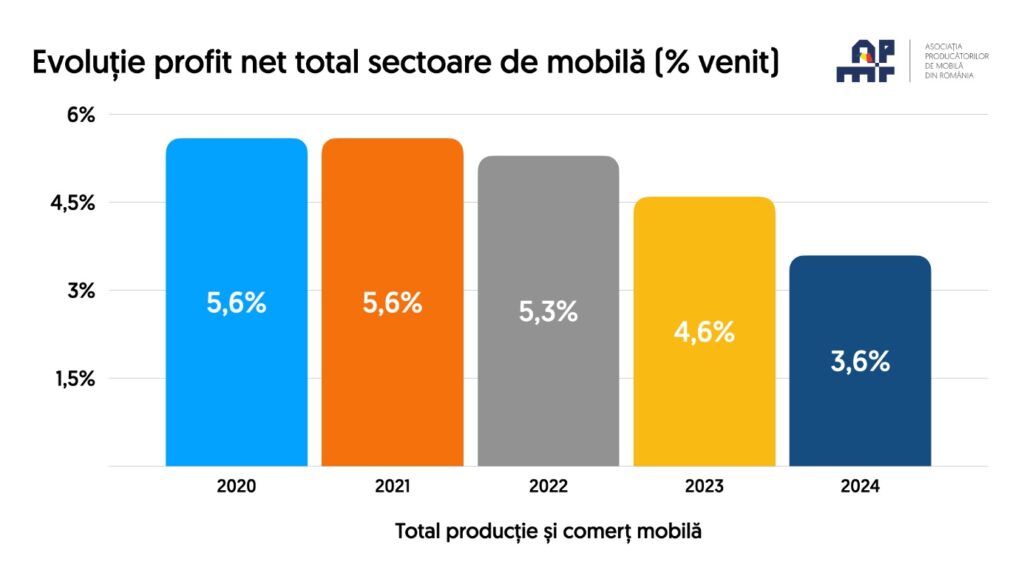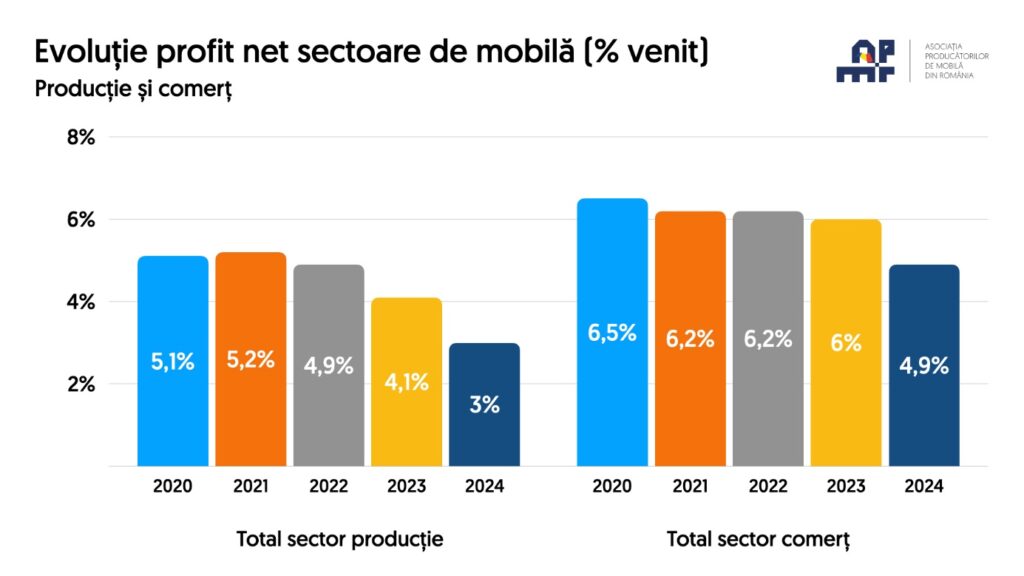 • Profitabilitate netă: 3,6% în sectorul de mobilă, 19,8% în arhitectură/design