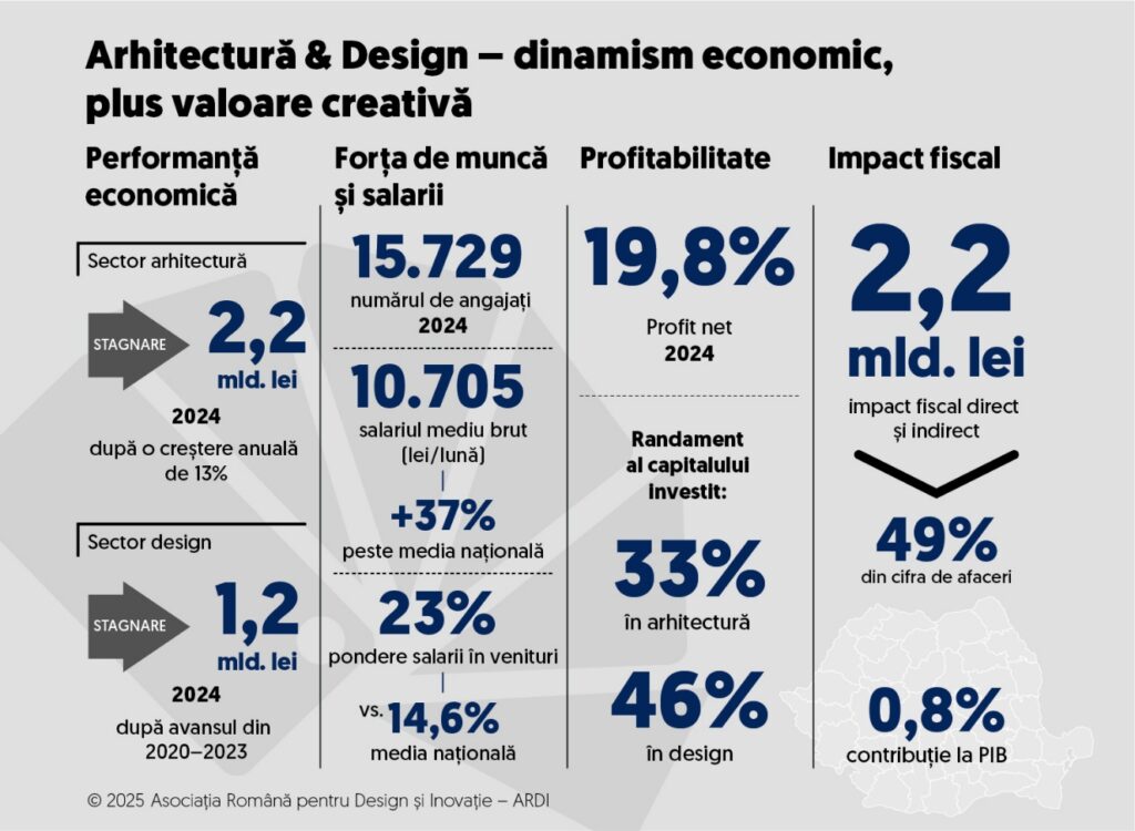 În paralel, sectorul arhitectură și design continuă să înregistreze performanțe financiare solide, cu o profitabilitate de 19,8% și salarii medii cu 37% peste media națională. Cu un impact fiscal total de 2,2 miliarde lei, acesta contribuie la modernizarea investițiilor publice și private și la competitivitatea economiei românești.
