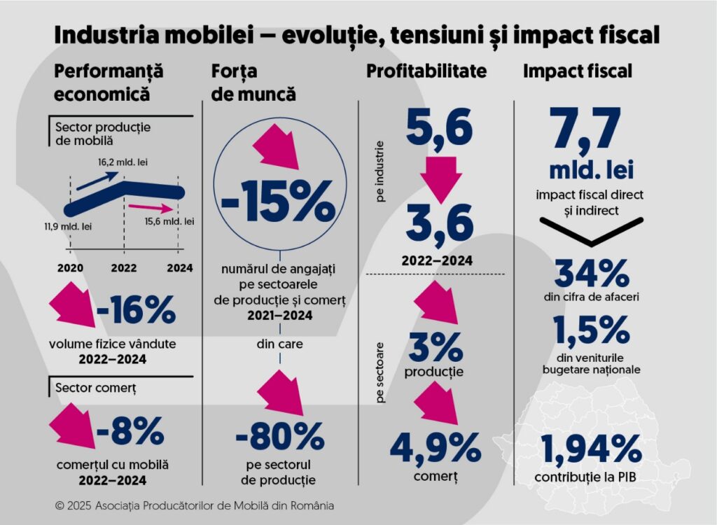 Sectorul de fabricare și comercializare a mobilei rămâne unul dintre cei mai mari contributori ai industriei prelucrătoare a României, generând 7,7 miliarde lei impact fiscal total în 2024. Cu toate acestea, industria se confruntă cu provocări majore: scăderea volumelor vândute cu 16%, reducerea numărului de angajați cu 15% și o diminuare a profitabilității la 3,6%.