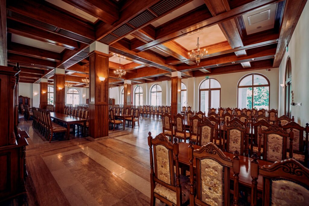 La noul centru, am ales să lucrăm cu stejar. Iar sala de mese are și MDF furniruit. Este o structură de OSB, peste care s-a pus acest MDF. La îmbinări este stejar. Era nevoie de o structură ușoară, dar care să arate și bine”, a precizat părintele Iustinian pentru forestmania.ro.