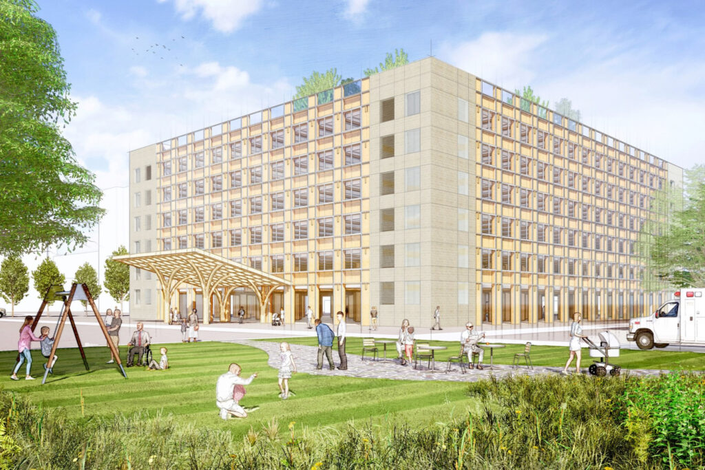 Clădirea cu șase etaje va fi construită din cherestea laminată încrucișată (CLT).
